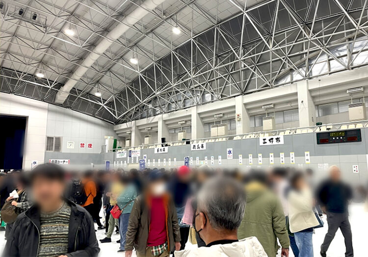 会場の外に既に沢山の人がいます。笑顔で日本酒を語り合うおじさんたちを横目に入場します。